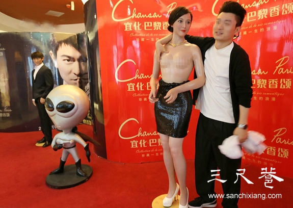 范冰冰蠟像受到了不文明對待。日前,湖北宜昌巿某樓盤用了多個不同造型的冰冰蠟像搞促銷,一名男子竟然將冰冰蠟像的連身裙上半身扯下,并摸著冰冰蠟像的胸部拍照。