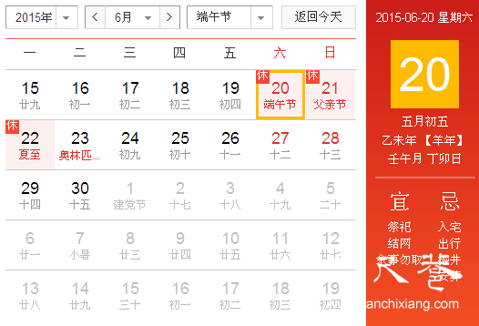 昨天,北京市政府辦公廳發(fā)布的《關(guān)于2015年端午節(jié)放假安排的通知》稱,根據(jù)國務(wù)院辦公廳通知精神,今年端午節(jié)放假安排為6月20日(星期六)放假,6月22日(星期一)補(bǔ)休。(5月30日新京報(bào))