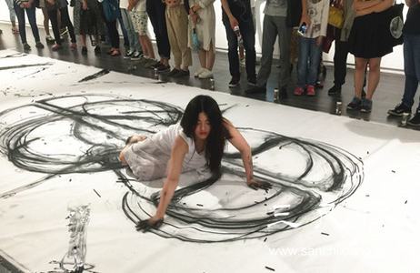 在藝術(shù)界,以身體為“筆”在畫布或紙張上涂抹出“作品”的表演屢見不鮮,算不得什么新聞了。這舉動(dòng)也并非年輕藝術(shù)生的創(chuàng)新,屢見任教于某些藝術(shù)院校的當(dāng)代書畫名家即熱衷此道。或是將巨紙鋪滿整個(gè)展館,