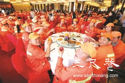 請(qǐng)環(huán)衛(wèi)工人吃飯不是什么新鮮事, 4月27日,桂林市200名一線環(huán)衛(wèi)工人受邀至七星區(qū)一家飯店吃大餐,大家歡聚一堂共慶“五一”迎“五四”節(jié)日。4月30日,60多名環(huán)衛(wèi)工人在芙蓉區(qū)火星街道凌霄社區(qū)的夜宵店享受了一