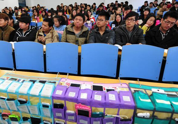 12月10日,河北師范大學(xué)信息技術(shù)學(xué)院課堂上,中央第一排桌椅空無一人,卻專為學(xué)生手機(jī)私人訂制了“座位”,學(xué)生們進(jìn)入教室后,將手機(jī)對名入袋。據(jù)學(xué)校介紹,