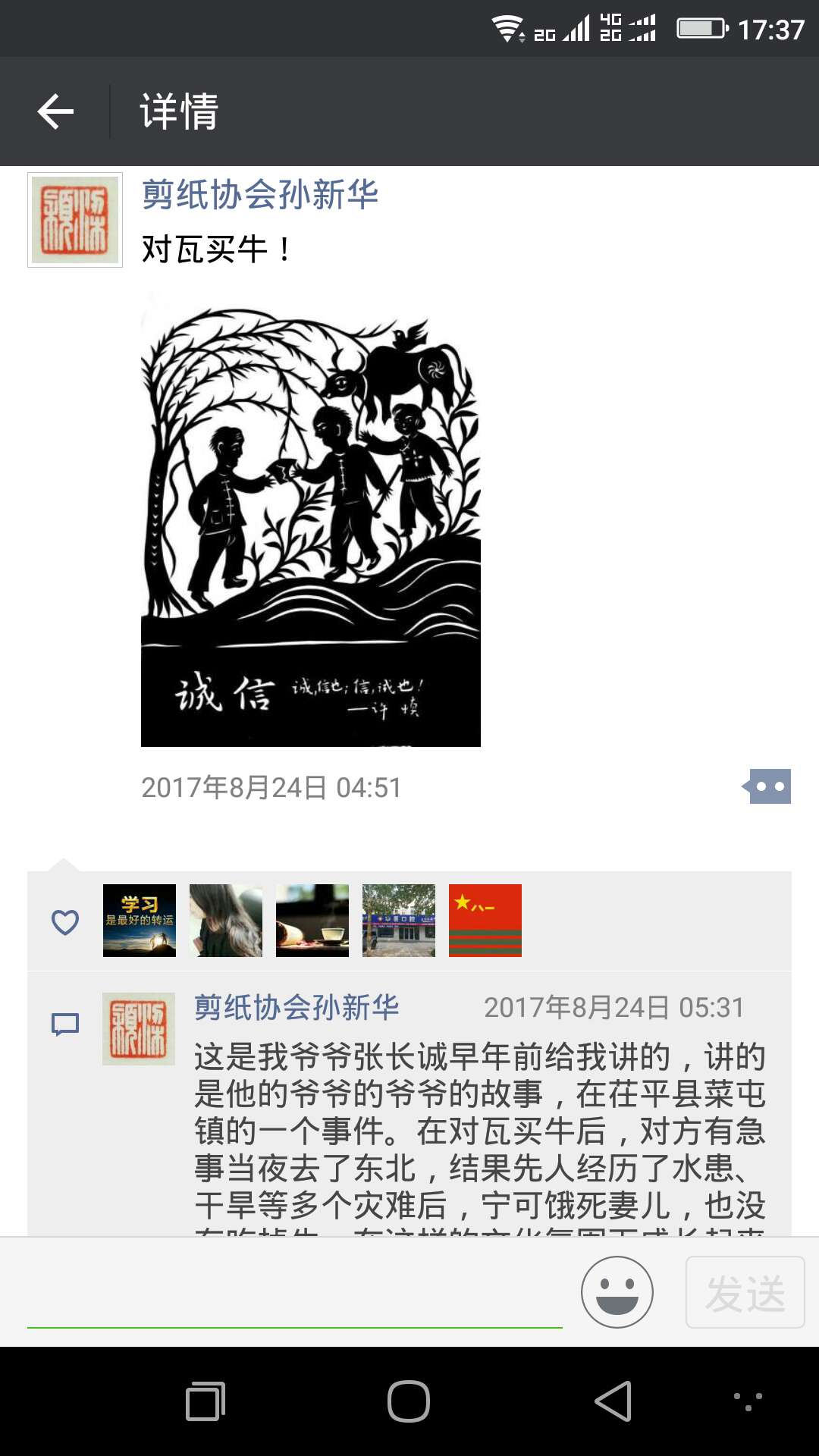 在剪紙的故事里,有滿滿的回憶,有親情,有友誼,有師恩,回想起來,感悟頗多。剪紙是一種民俗,也是一種文化,需要傳承,需要與時俱進。喜見孫新華能在剪紙事業(yè)上有傳承、有發(fā)展,甚喜,寫個小文以記之。