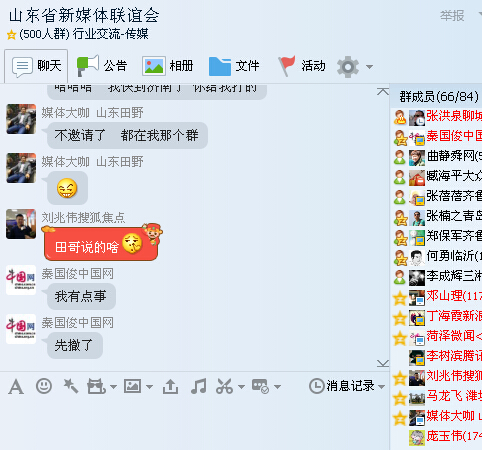 8月20日,由資深時(shí)評(píng)人張洪泉發(fā)起的“山東省新媒體聯(lián)誼會(huì)QQ群”(群號(hào)106881107)組建。在一天的時(shí)間內(nèi),已經(jīng)接收會(huì)員超過(guò)100人,其中主要是山東籍意見(jiàn)領(lǐng)袖、新媒體和傳統(tǒng)媒體的從業(yè)人員。在魯?shù)闹髁骶W(wǎng)站、紙媒、電臺(tái)、電視臺(tái)、各地市媒體從業(yè)人員都有加入。