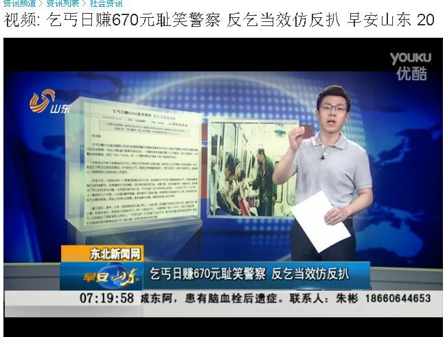 張洪泉作品《乞丐日賺670元恥笑警察 反乞當(dāng)效仿反扒》被山東衛(wèi)視讀報(2015年6月15日)