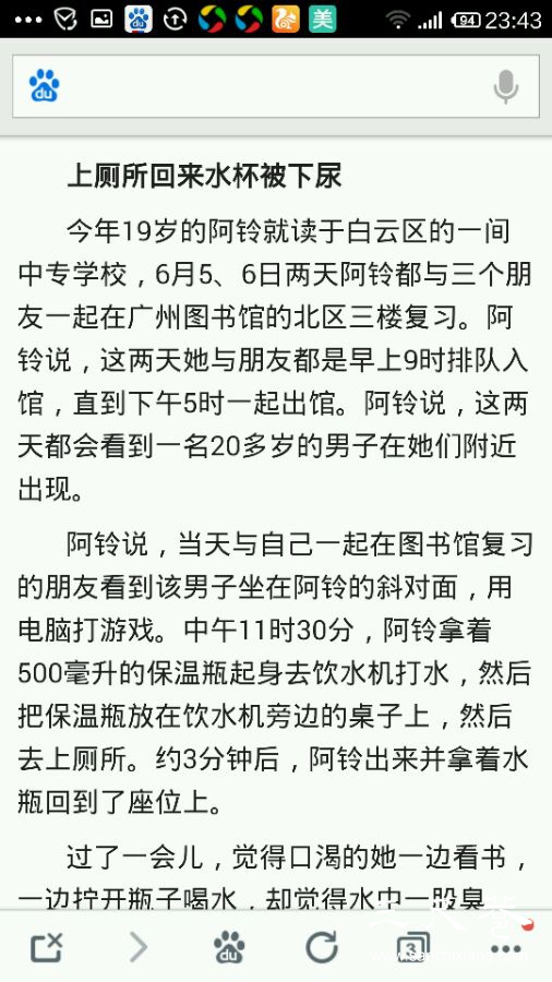 “太惡心了,直到現(xiàn)在我想起這件事還想吐!”5日中午,阿鈴在廣州圖書館內(nèi)緊張地復習,準備迎接即將到來的高考。可沒想到在她上廁所短短的3分鐘內(nèi),自己的保溫水瓶竟被一陌生男子灌了尿。通過監(jiān)控視頻警方鎖定了一名20余歲的男子,隨后其被警方帶走調(diào)查,這名男子承認了自己的行為。(6月7日《羊城晚報》)