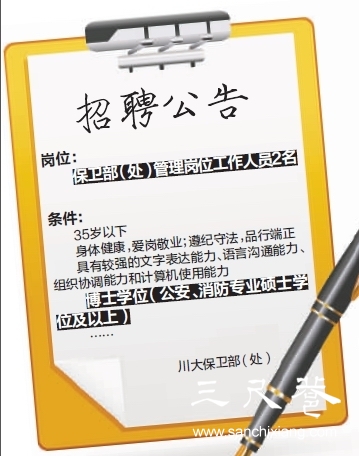 給川大保衛(wèi)工作賦予太多的科技含量只是校方的臆想,實際情況并非如此。你想讓博士什么工作都能干,那樣可能嗎?一來違法勞動法,二來博士也不是金剛不壞身。招聘博士就得有博士的待遇,10萬年薪養(yǎng)一個保衛(wèi)人