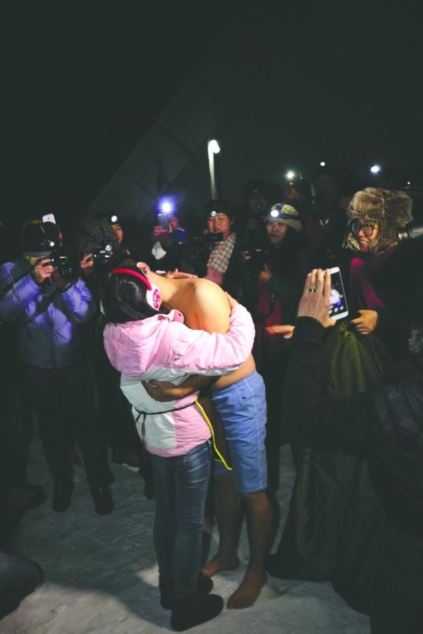 前晚(2014年12月31日),在海拔3600米的海螺溝風(fēng)景區(qū)的冰天雪地中,氣溫低至-9℃。26歲的成都小伙兒王浩儒光著腳丫,只穿著短褲,肚皮上寫著“嫁給我”,向女